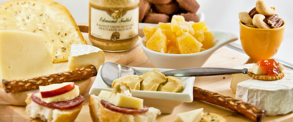 We harmoniously assembled a selection of gourmet cheeses complimented by apple pecan or Cherry and calvados cheese pleaser. The gourmet medium hot mustard favored by many, sesame crackers, herb crackers, pairs perfectly with the cheeses. The carefully selected Cranberry Medley dried fruits, pretzels, Snack mix, and a variety of jumbo nuts will definitely please the crowd. Makes a suitable addition to a fruit basket to send it to a family gathering.